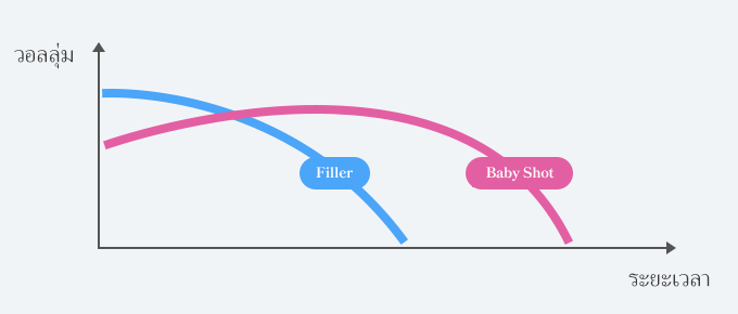 ในกรณีของฟิลเลอร์ จะเห็นผลการเพิ่มวอลลุ่มทันที แต่เมื่อเวลาผ่านไป ฟิลเลอร์จะถูกดูดซึมเข้าสู่ร่างกายอย่างช้า ๆ ส่งผลให้ปริมาตรลดลงอย่างค่อยเป็นค่อยไป ขณะที่ รามิเช Baby Shot จะกระตุ้นการสร้างคอลลาเจนอย่างต่อเนื่อง ทำให้ความหนาแน่นของคอลลาเจนในผิวเพิ่มขึ้นอย่างต่อเนื่องจากภายในผิวหนัง